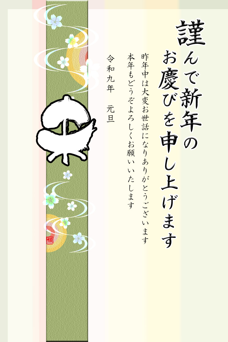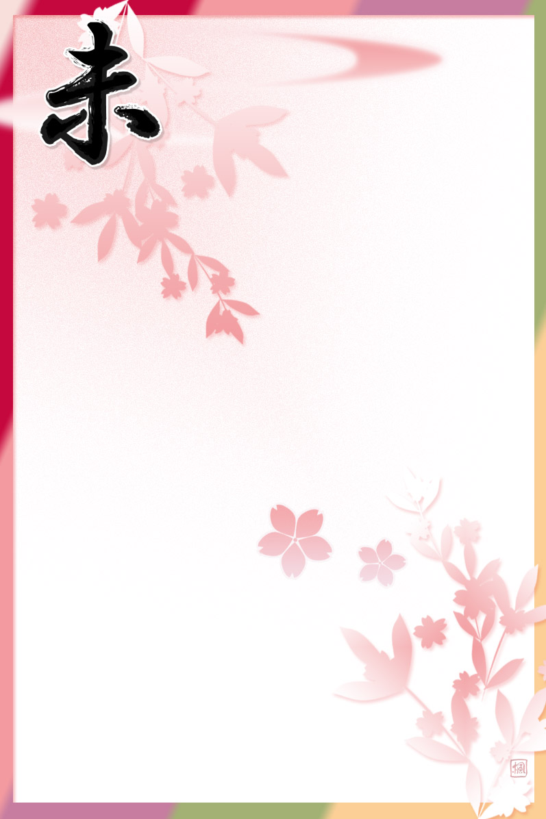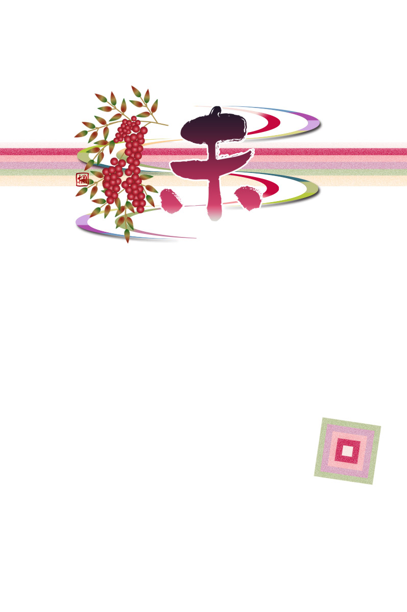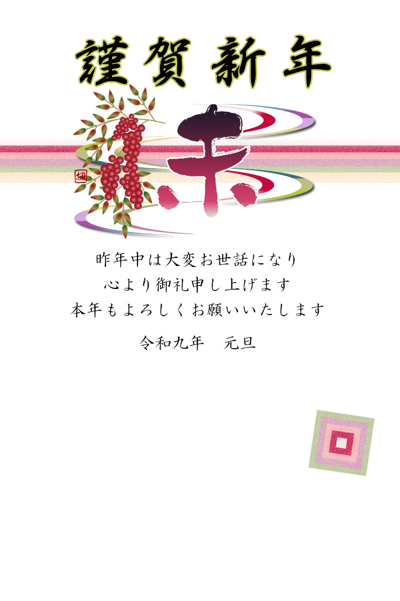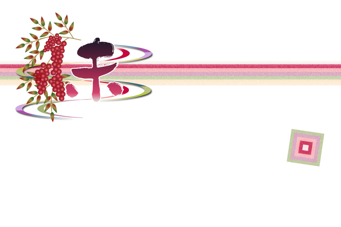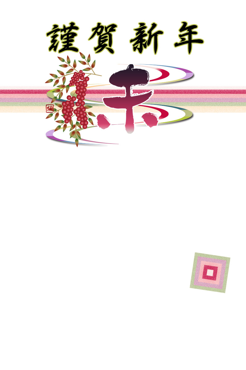 未のデザイン賀詞をメインとした、短冊に波紋としぼり柄を添えサクラを散りばめました。業種や年代を問わず幅広く年賀状としてお役立ちいただけます。 未のデザイン賀詞にインパクトのあるラインで華やかさのある南天と波紋を添えた賀詞入り年賀状。 落ち着いた着物柄の背景と子のデザイン賀詞入り年賀状です、サクラの花のイラストも背景と同色にしてデザイン賀詞が引き立つテンプレートです。