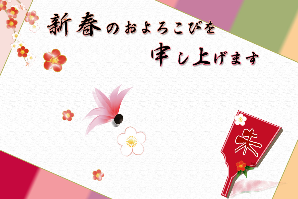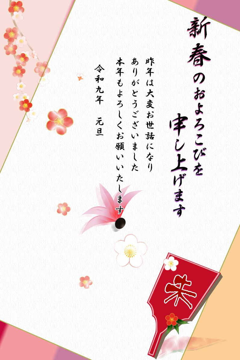 全体に縁起の良い赤い色をメインに紅白の梅の花や羽子板を添えたデザイン賀詞の年賀状
