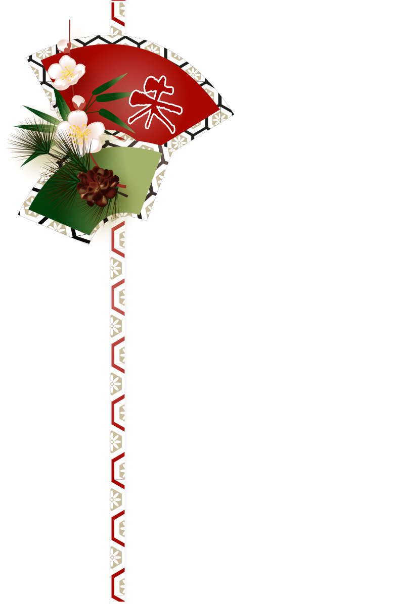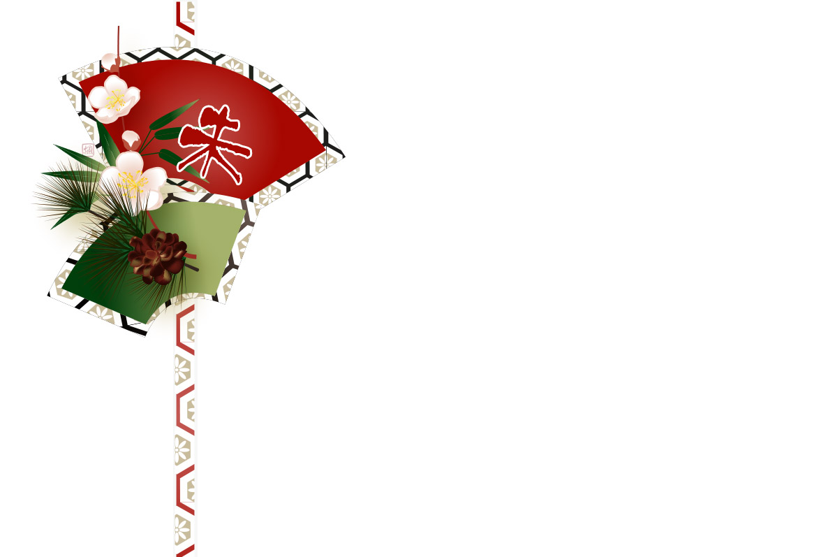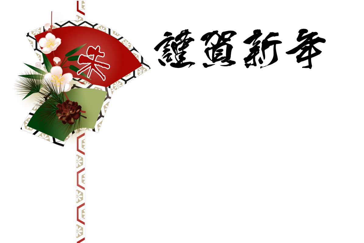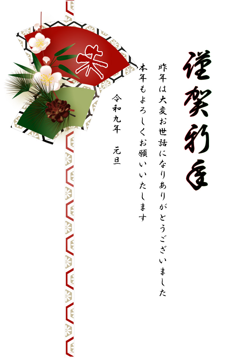 赤い扇に賀詞を添え、松竹梅の飾りを描いたシンプルなデザイン。