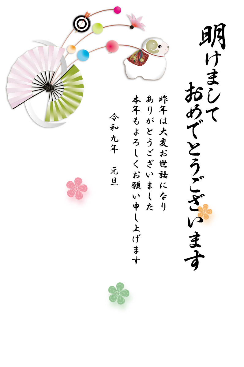 ひつじの置物に玉飾りと扇子のデザインです。賀詞は明けましておめでとうございますの文字です。