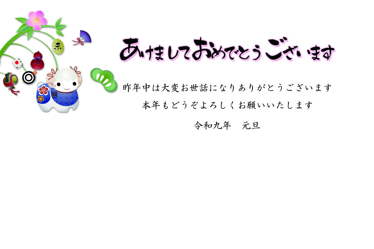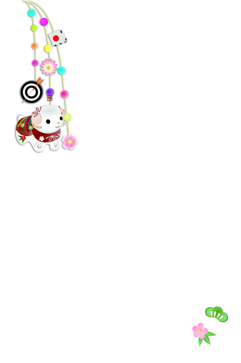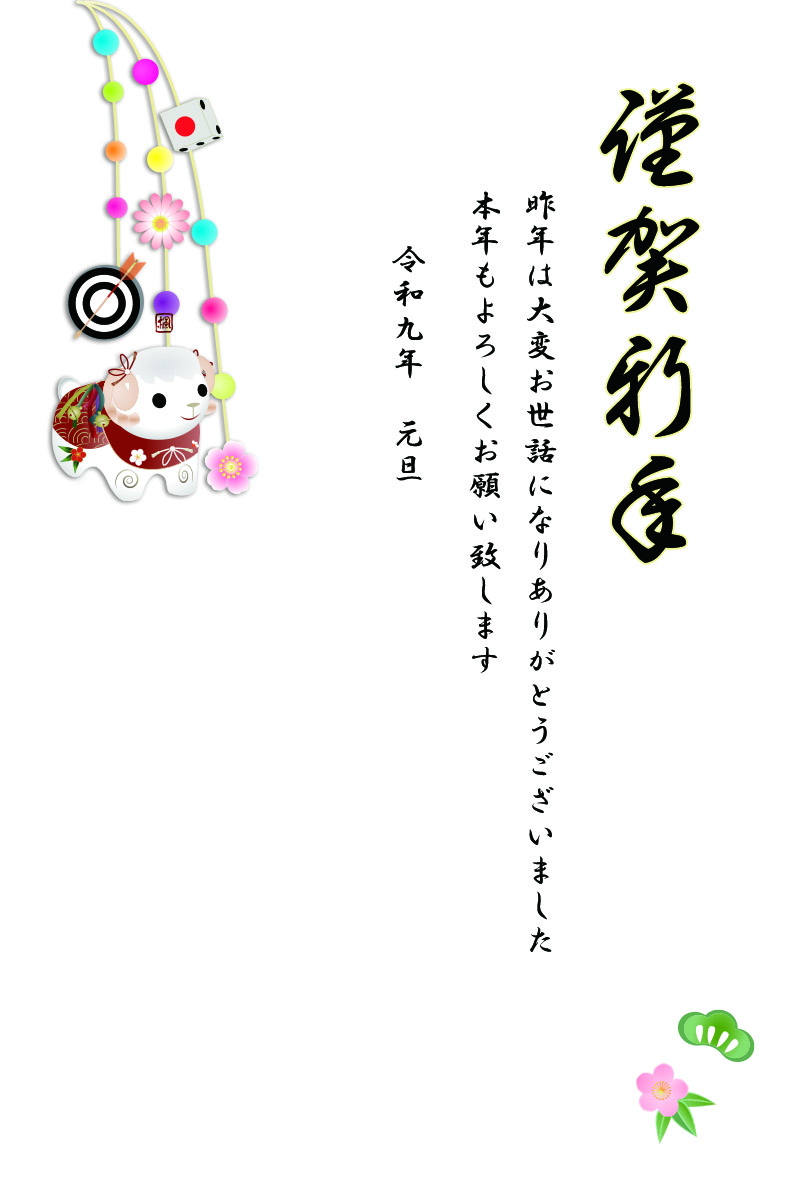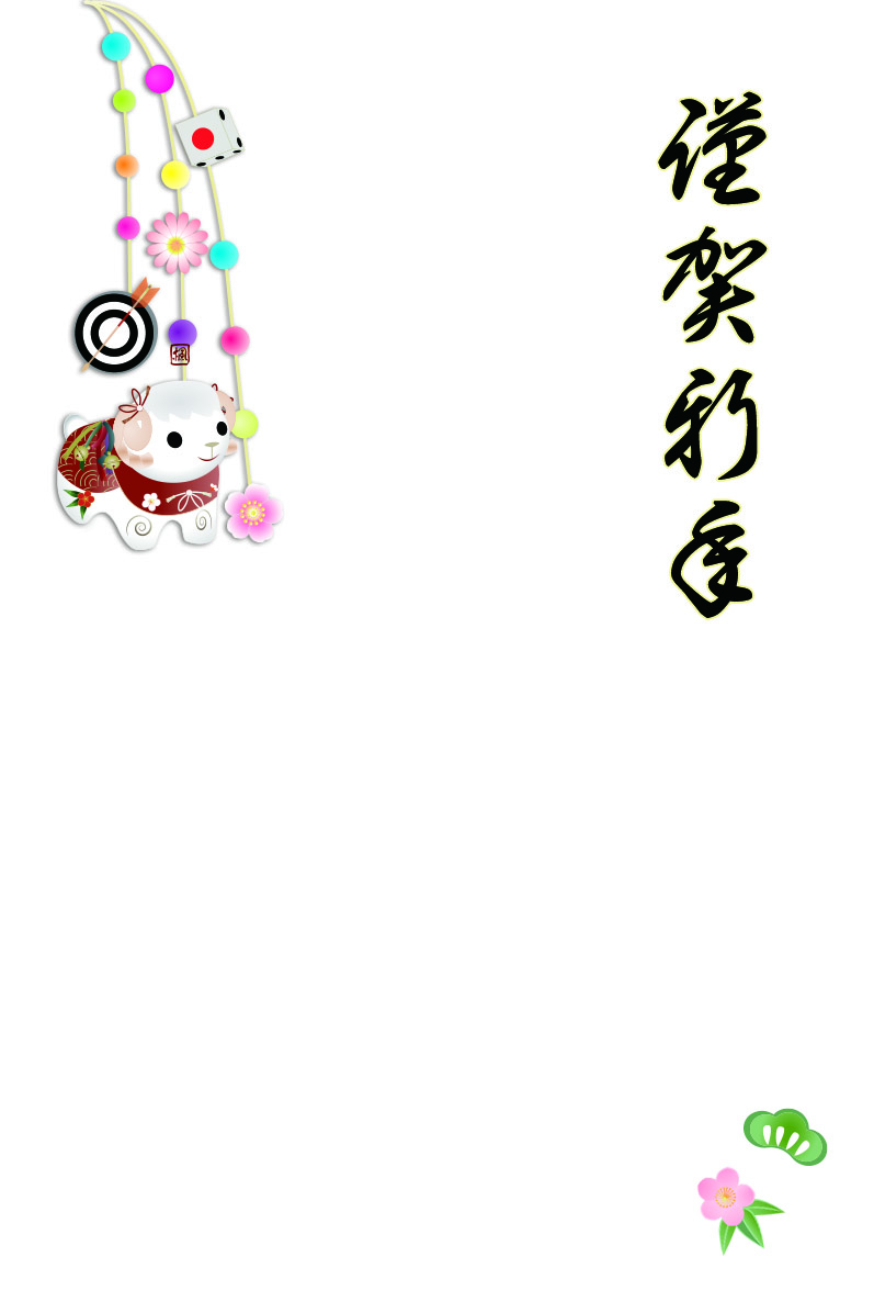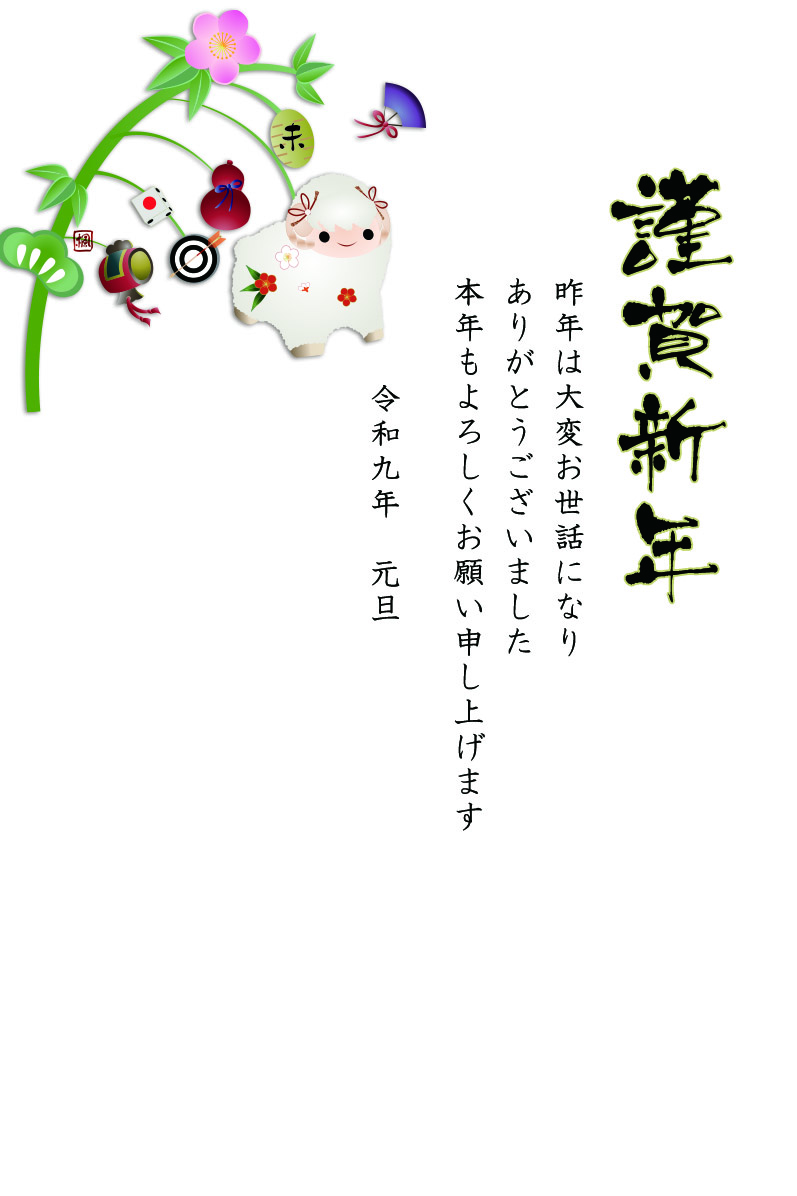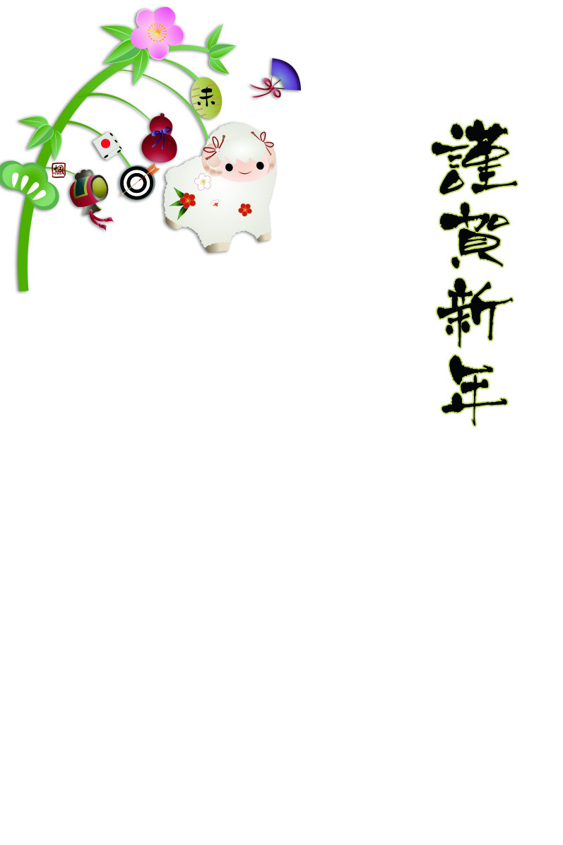年賀状テンプレートは未の飾りにひょうたんに小判を吊るした玉飾りのデザインです。