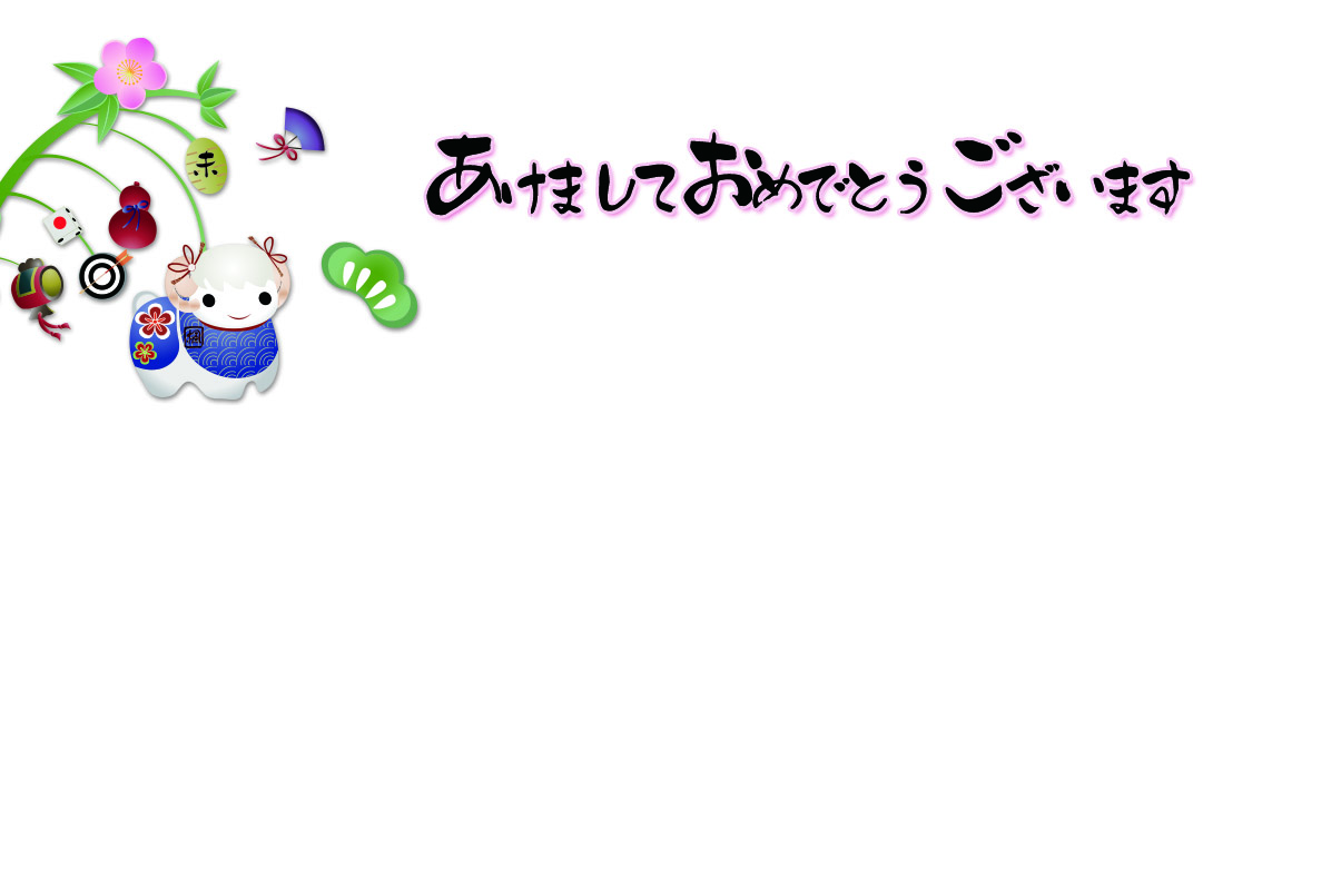 未の置物に縁起物とまゆ玉を吊るした玉飾りのイラストの横型のテンプレートです。賀詞はあけましておめでとうございますの文字です。