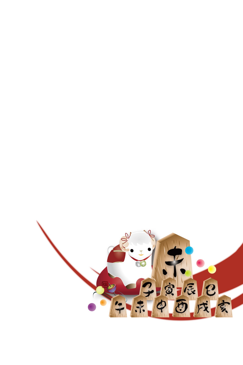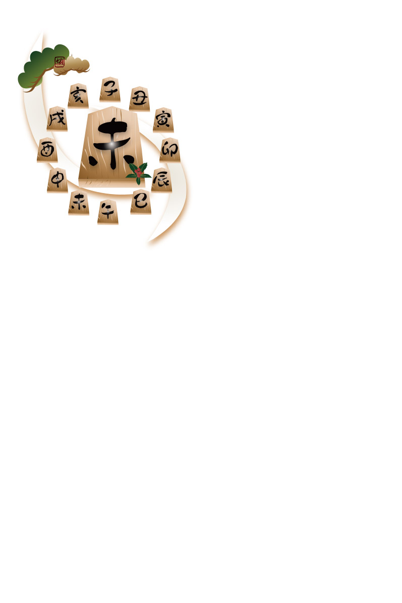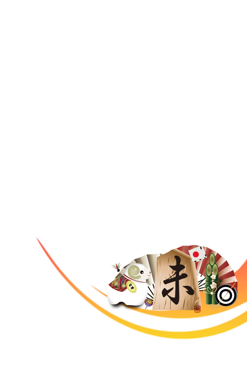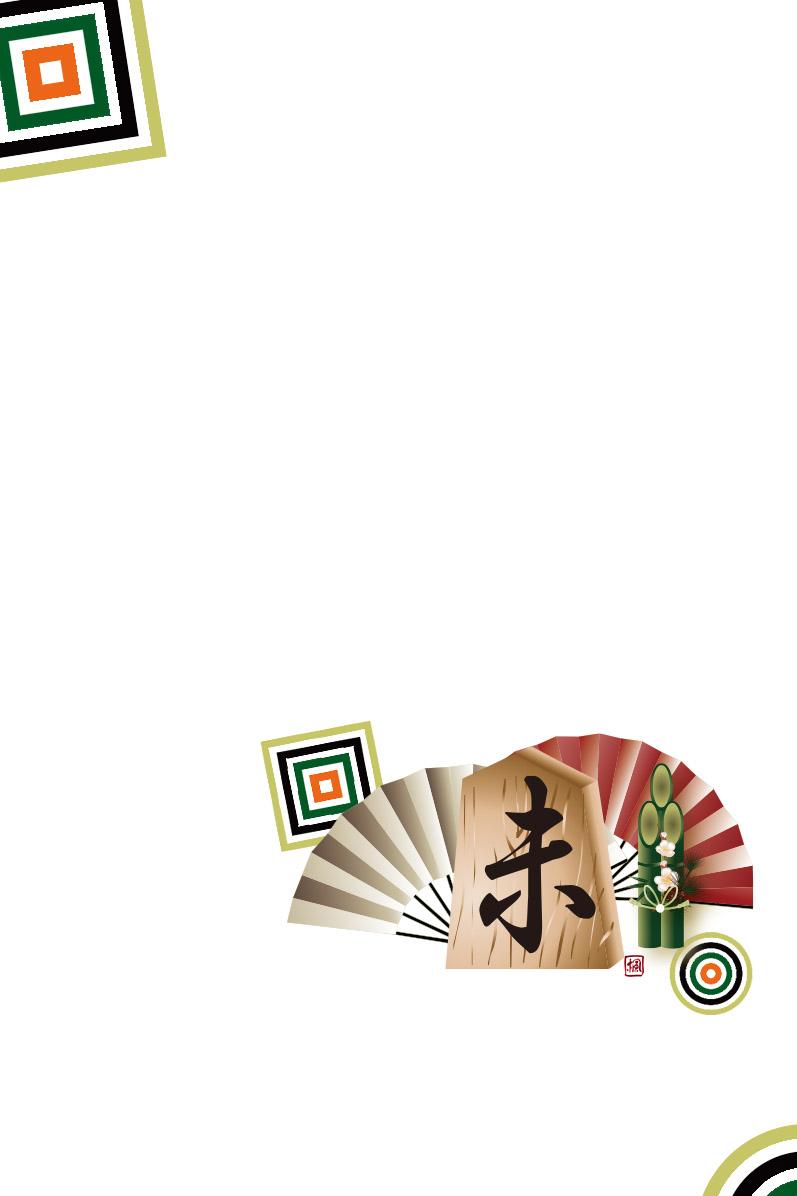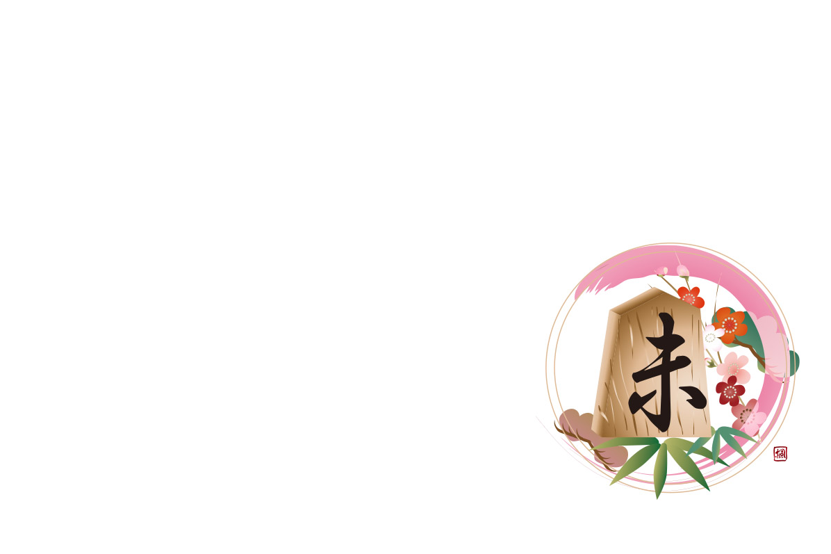 背景に筆で湾曲したのライン 下右から同色のラインに将棋の駒に未の文字のイラスト(以下ラインと将棋の駒と称します)
