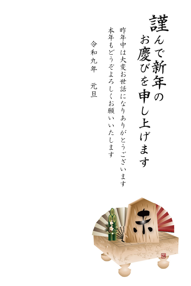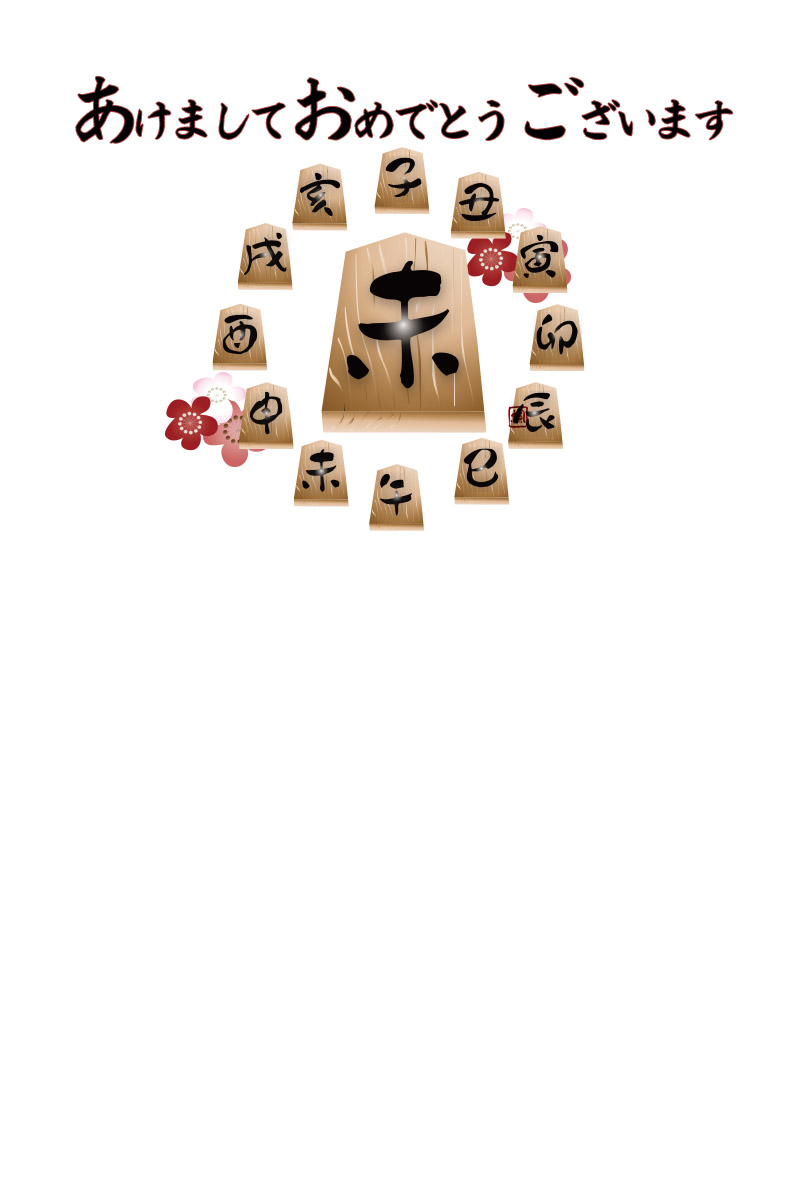 松竹梅を添えたイラストが中央から少し左に書いてあるイラストです。(以下 横型の午の文字の将棋の駒と松竹梅と称します)