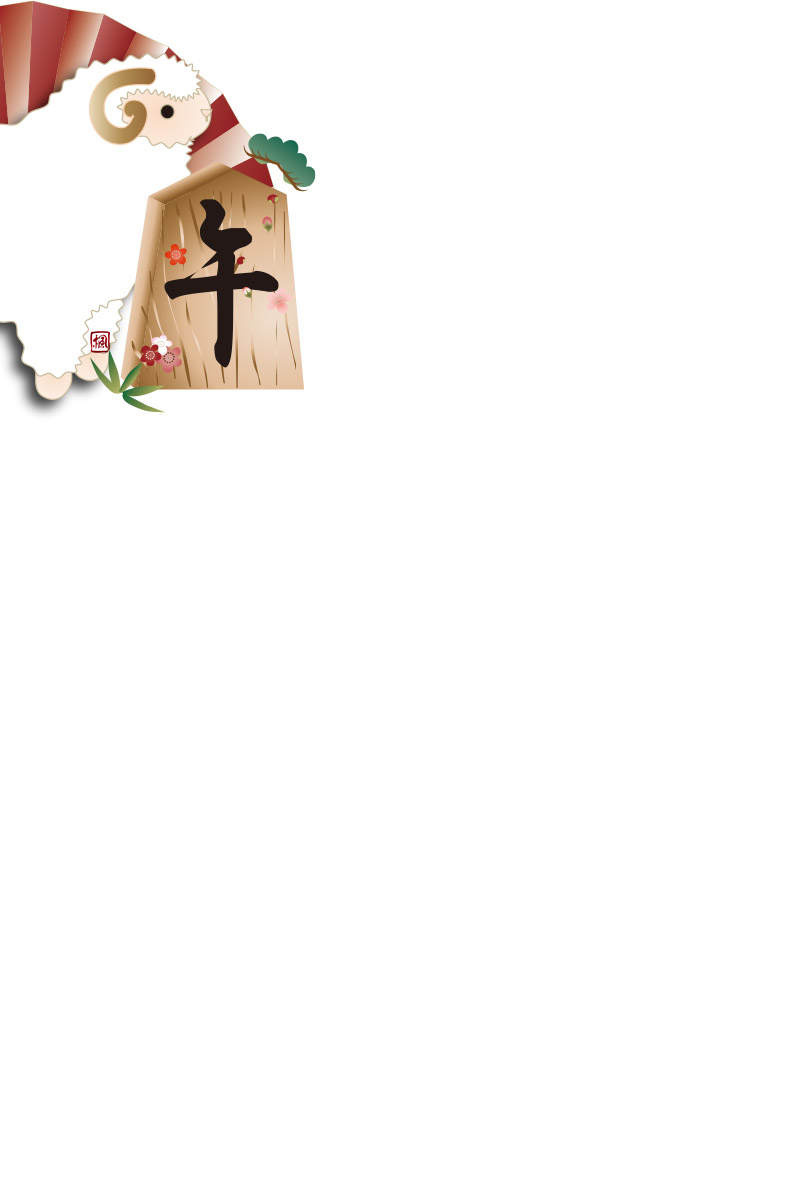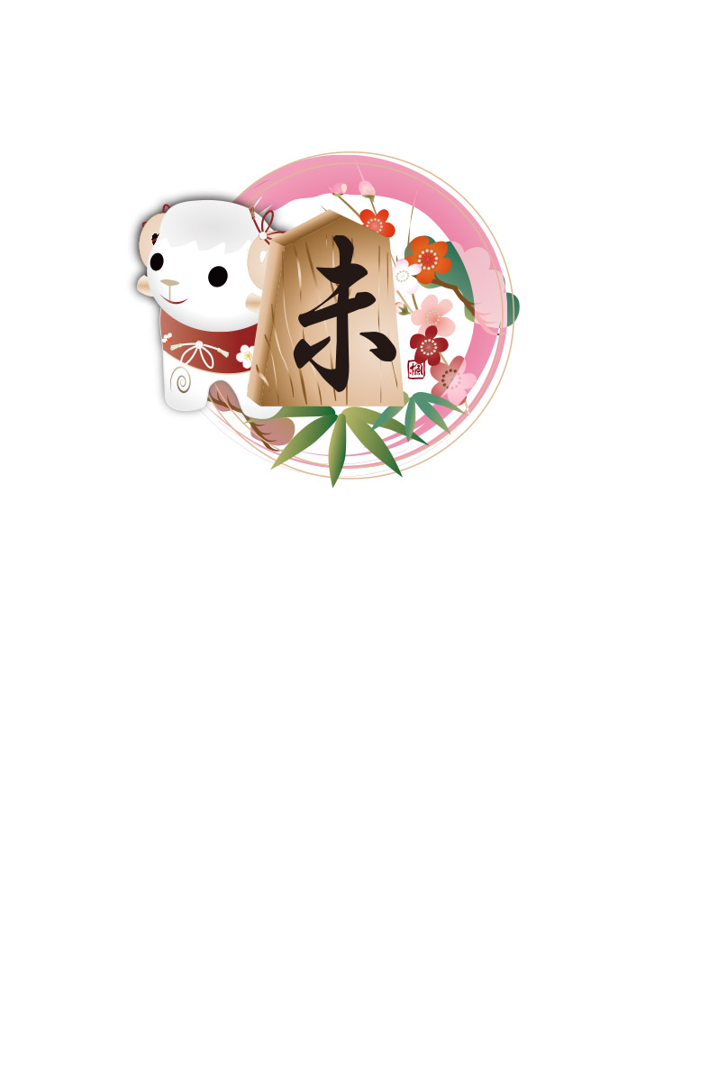 下から上に筆で書いた太いピンクラインに将棋の駒の未の文字に松竹梅を添えたイラストが