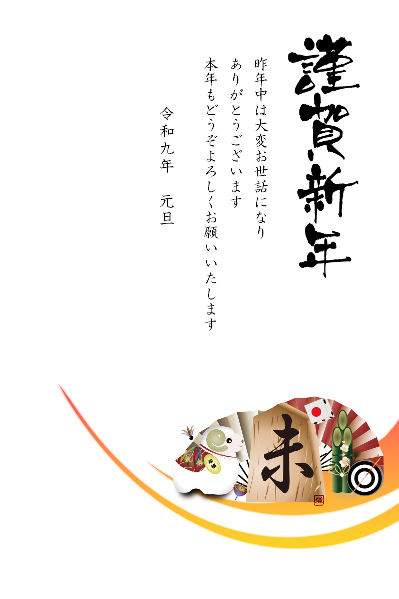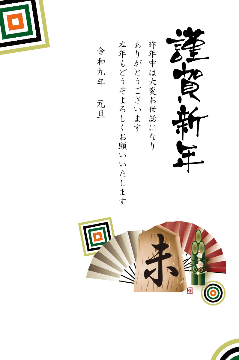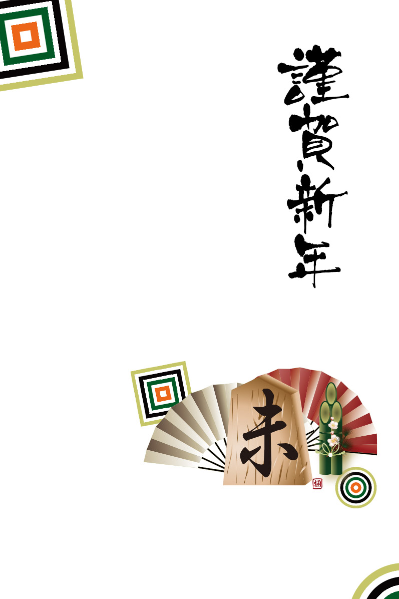 未の文字のイラストの横型年賀状テンプレートです(以下横型のラインと将棋の駒と称します)