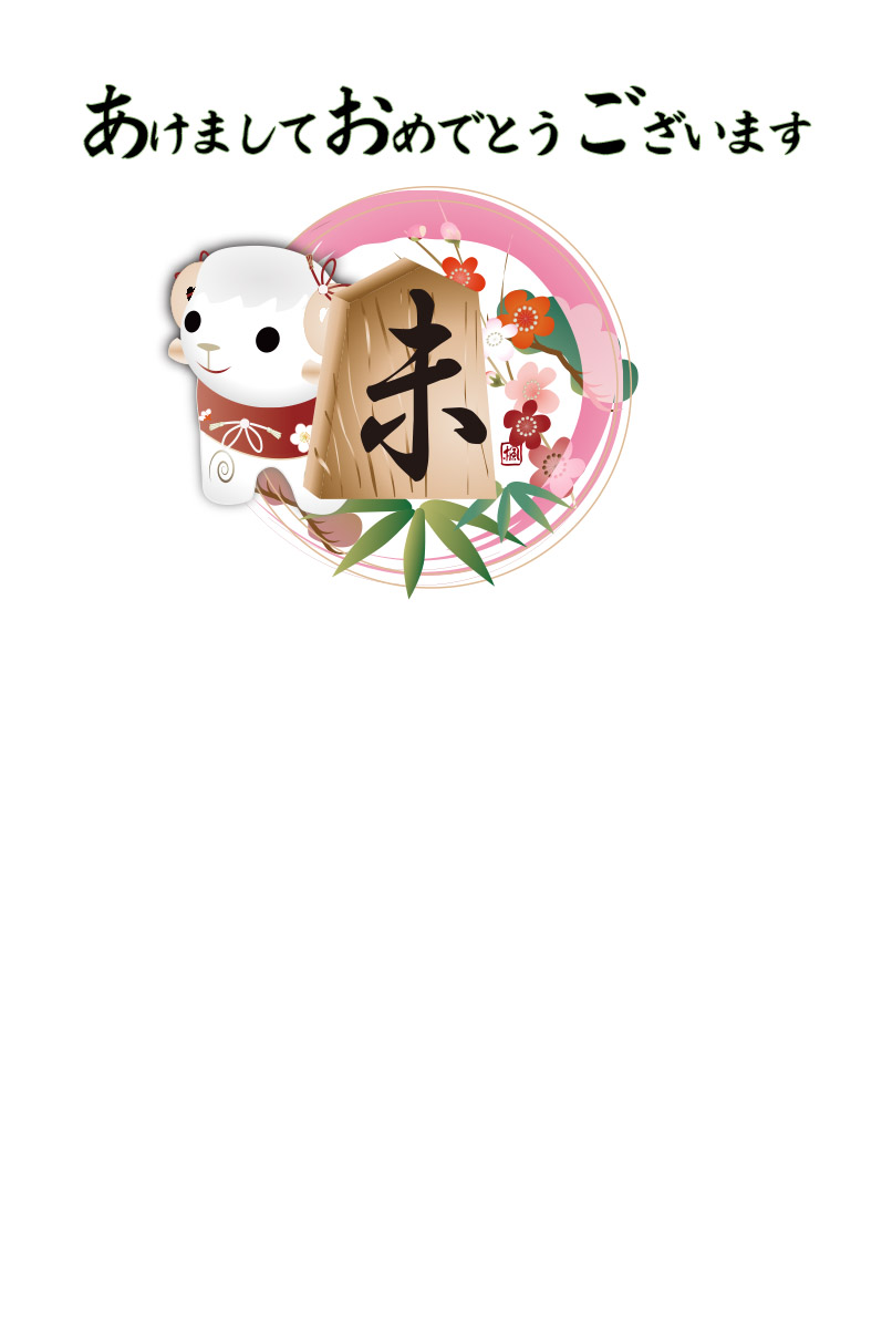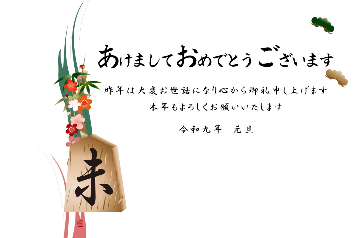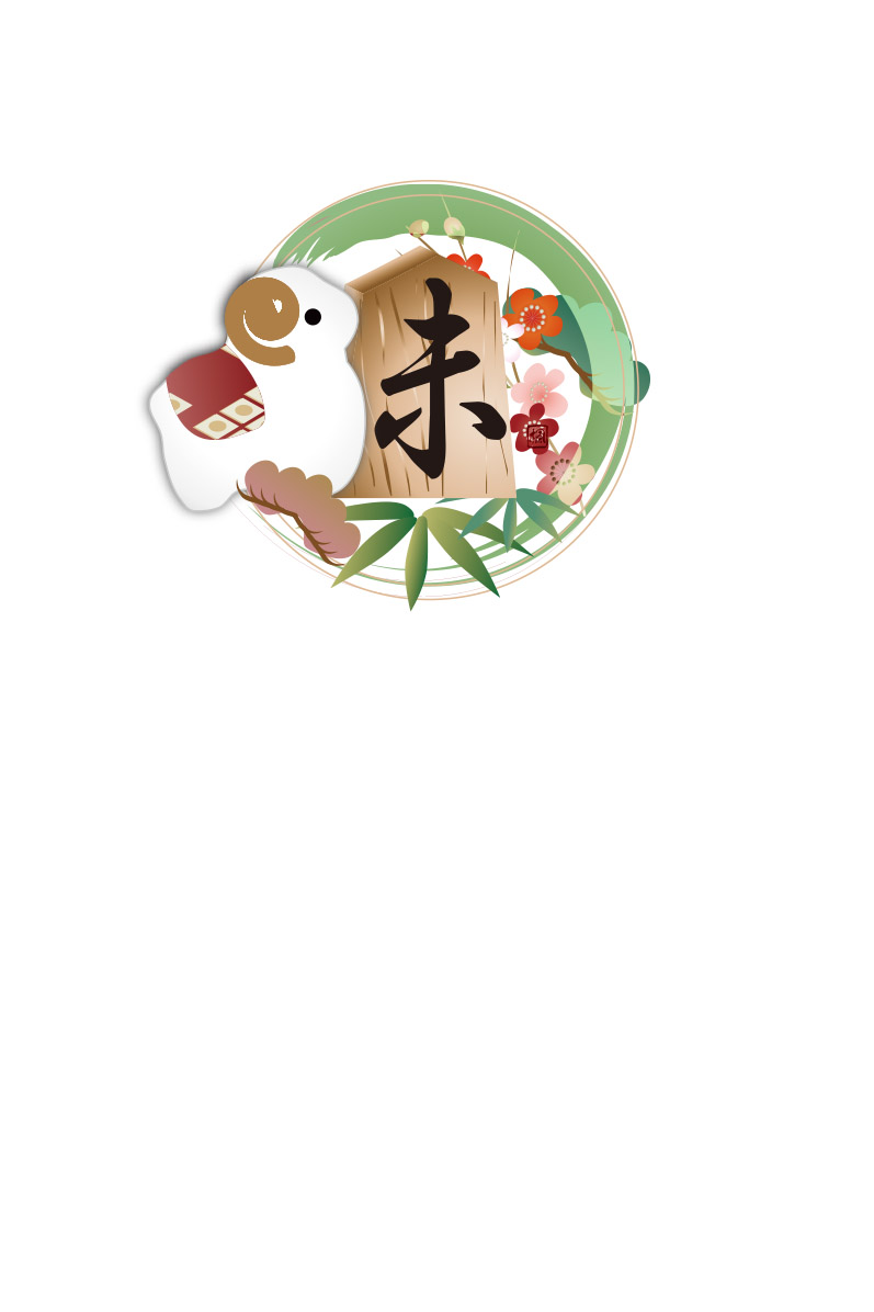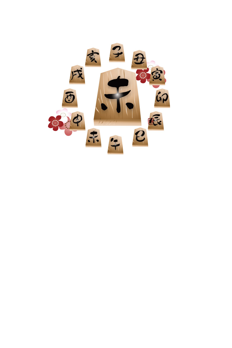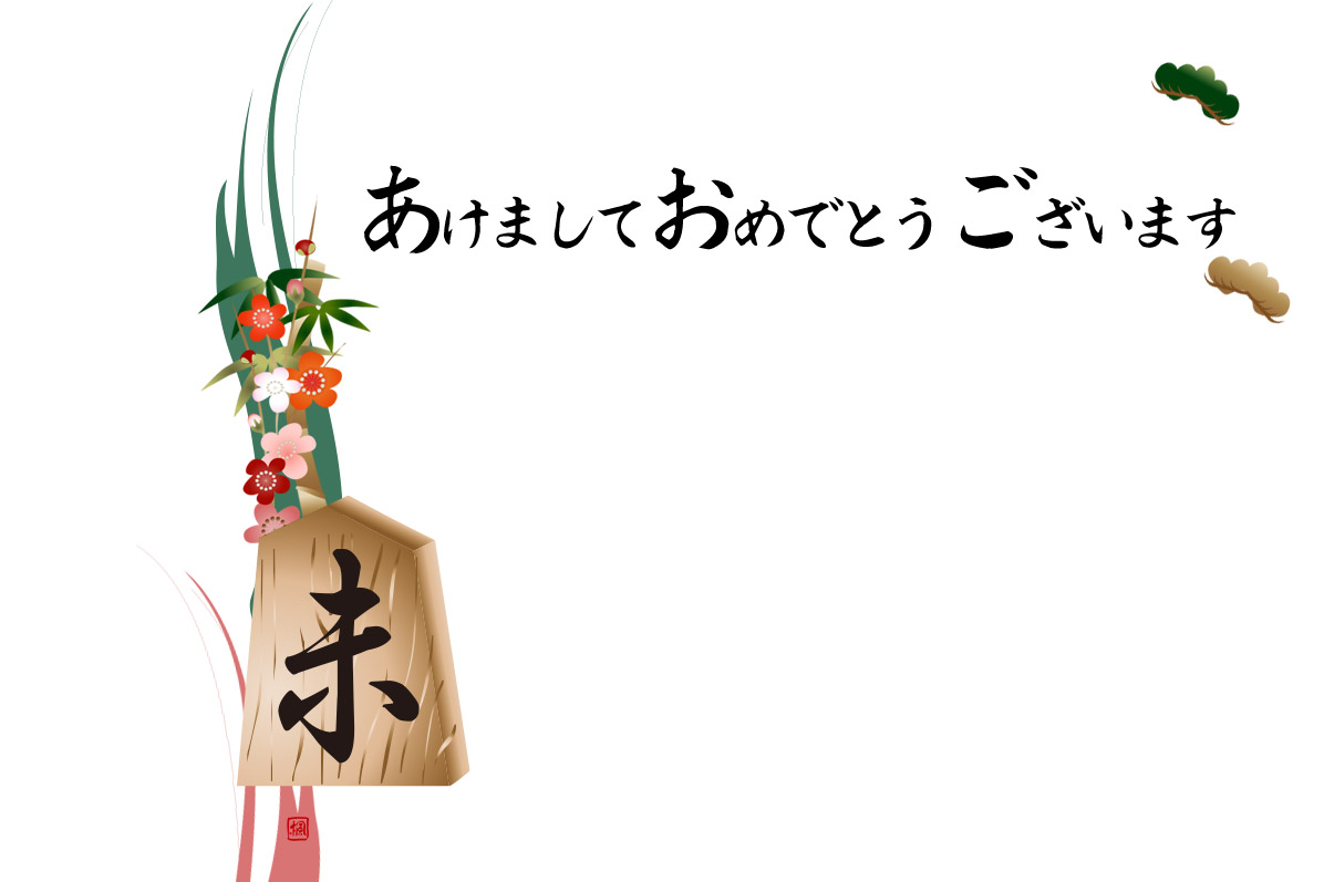 筆で書いた円に将棋の駒に未の文字に松竹梅のイラストを