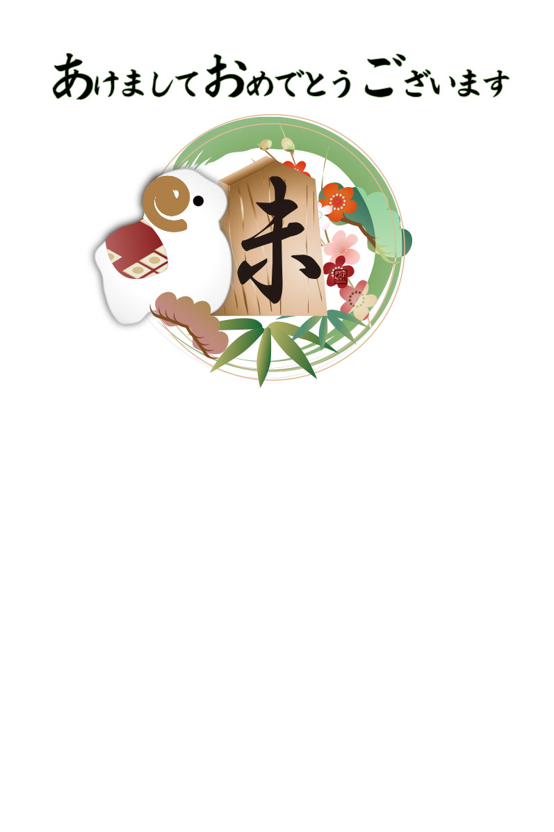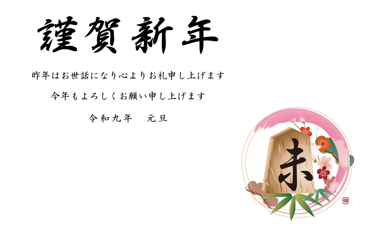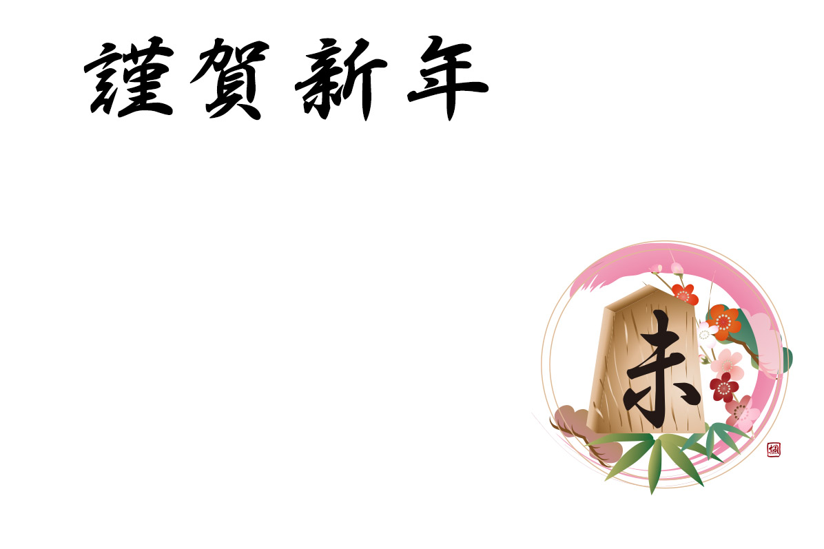 年賀状テンプレートは将棋の駒の未の文字に松竹梅を添えたイラストです。
