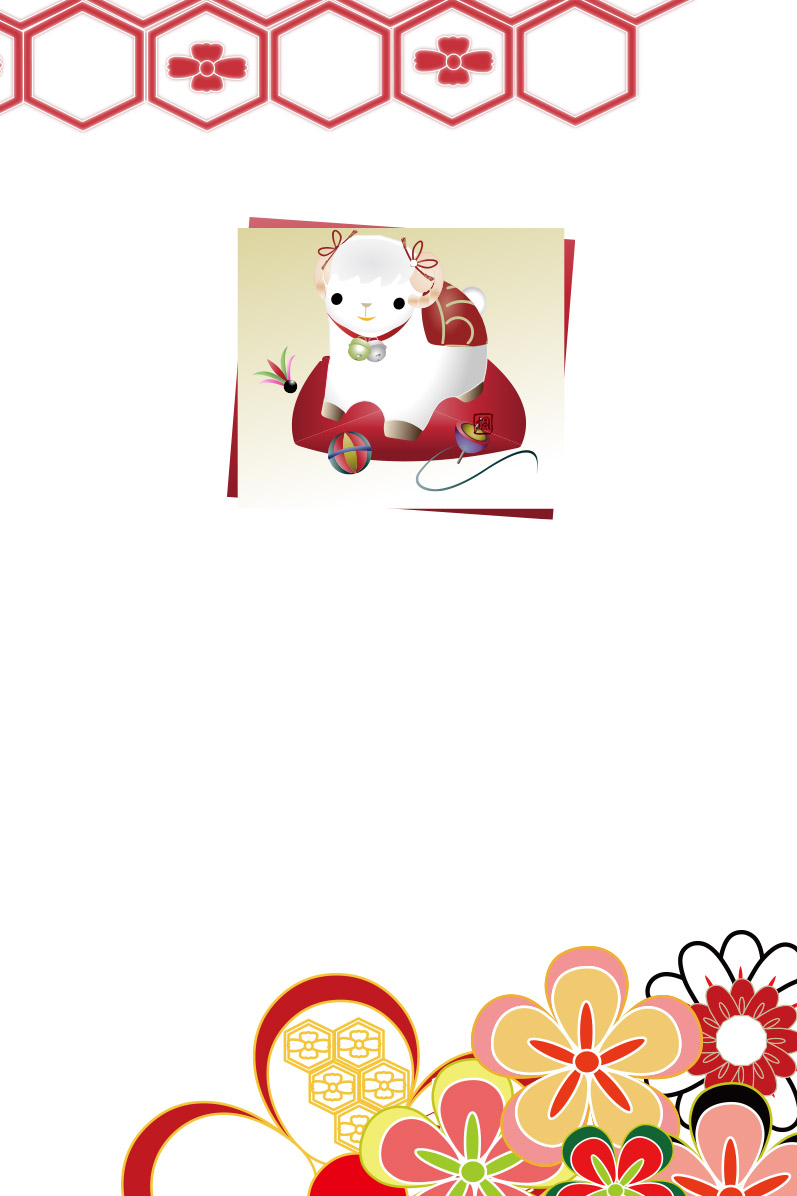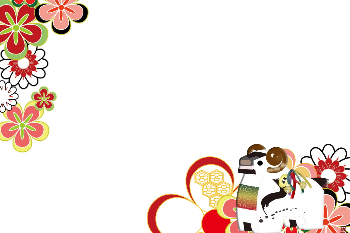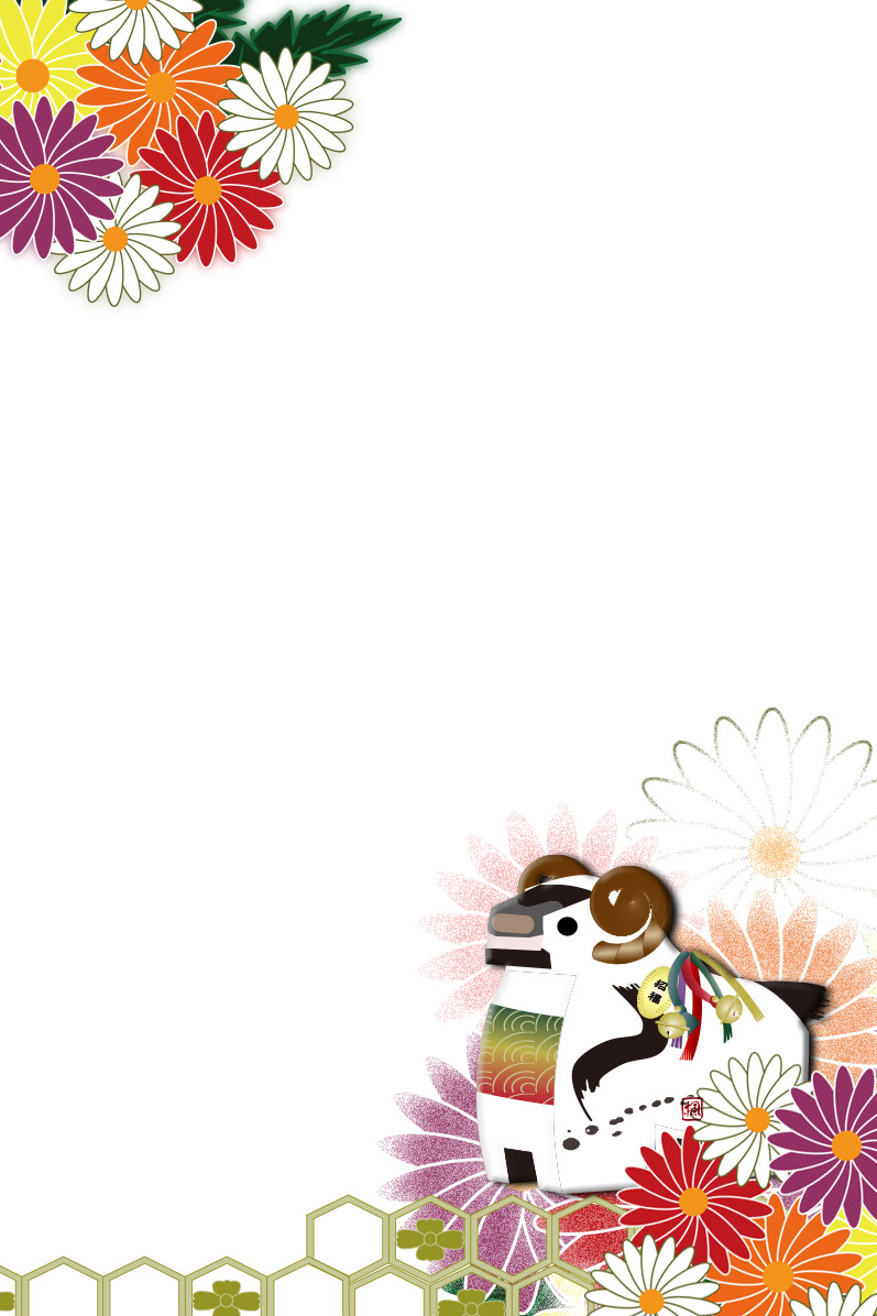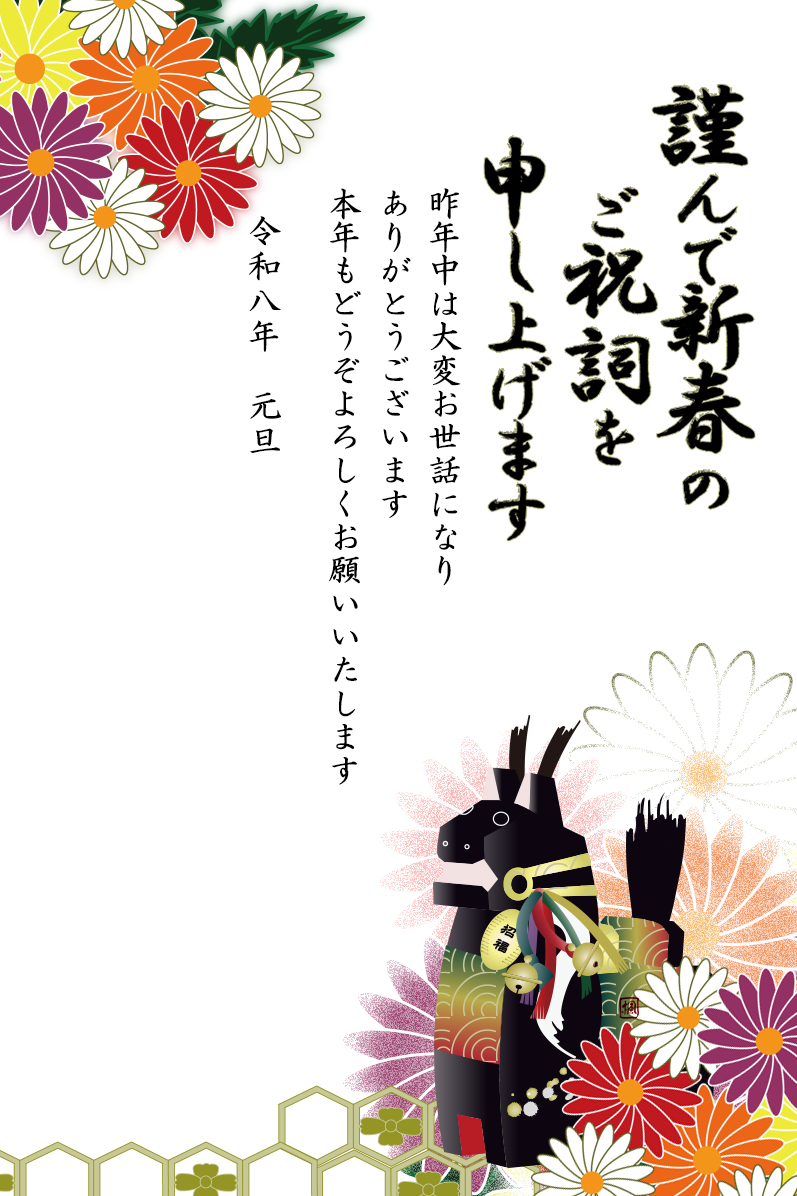 うまの置物と和柄の年賀状テンプレートは紅型や菊の花の着物柄を背景にしたデザインです