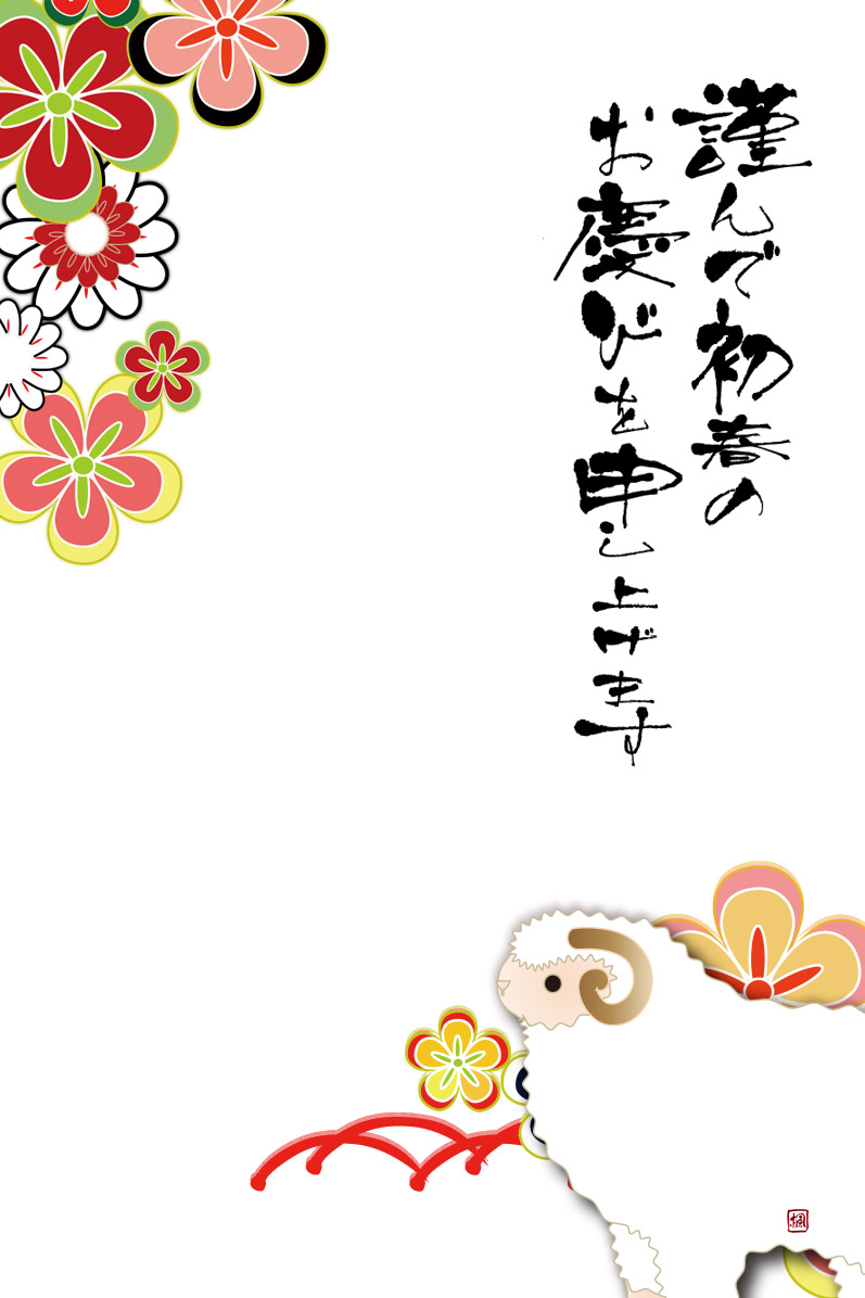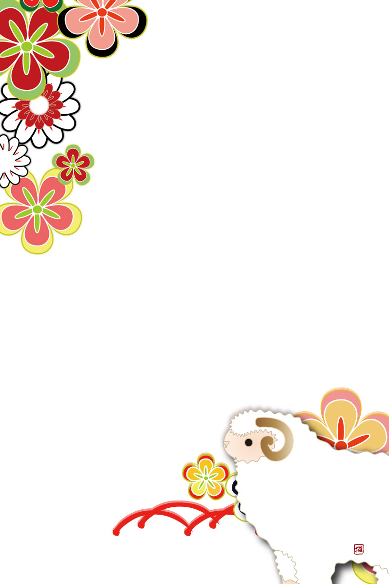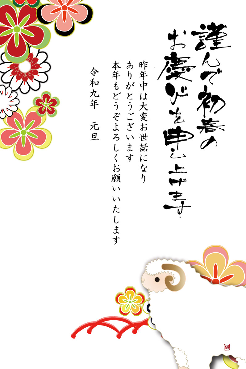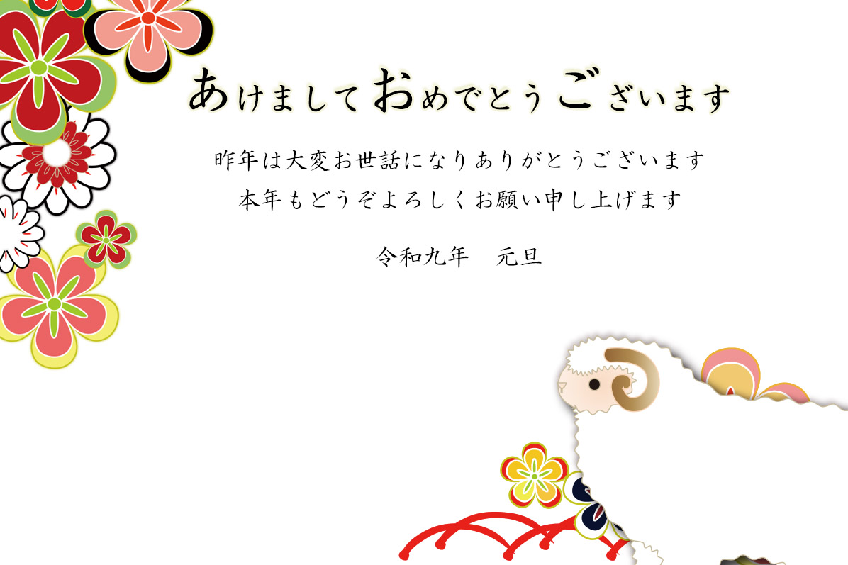 うまの置物と和柄の年賀状テンプレートは紅型や菊の花の着物柄を背景にしたデザインです