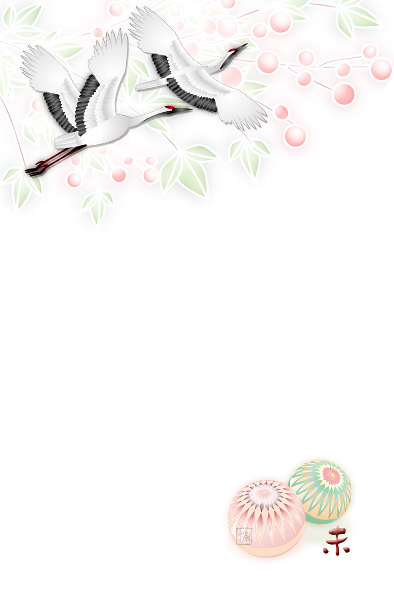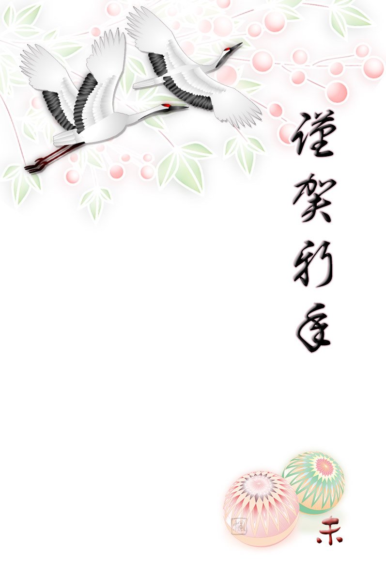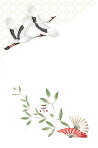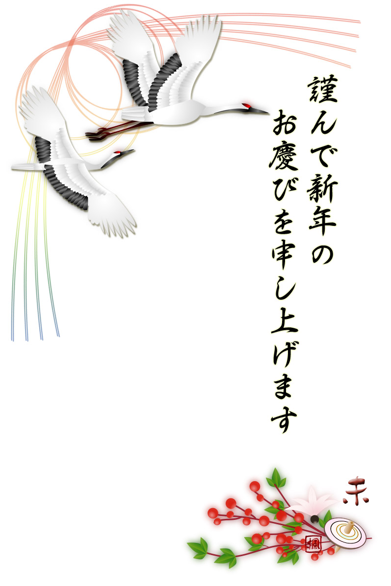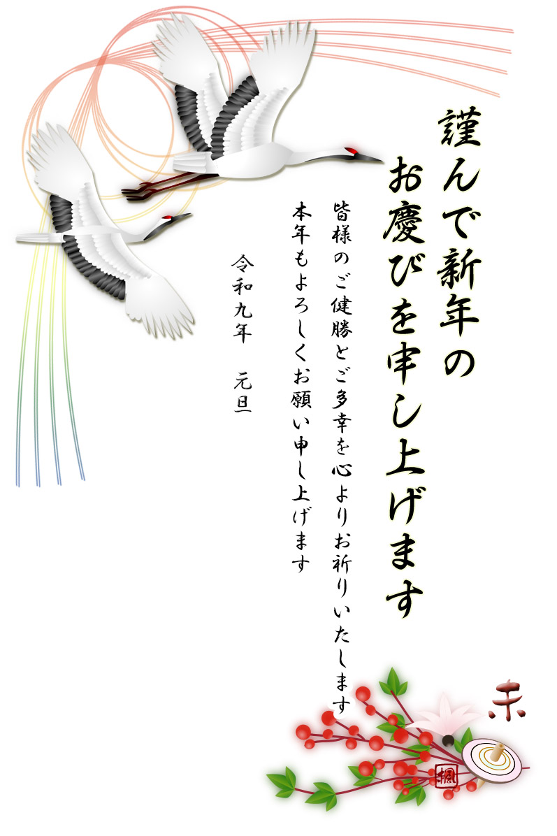 夫年賀状テンプレートは2羽の鶴が舞うイラストです。