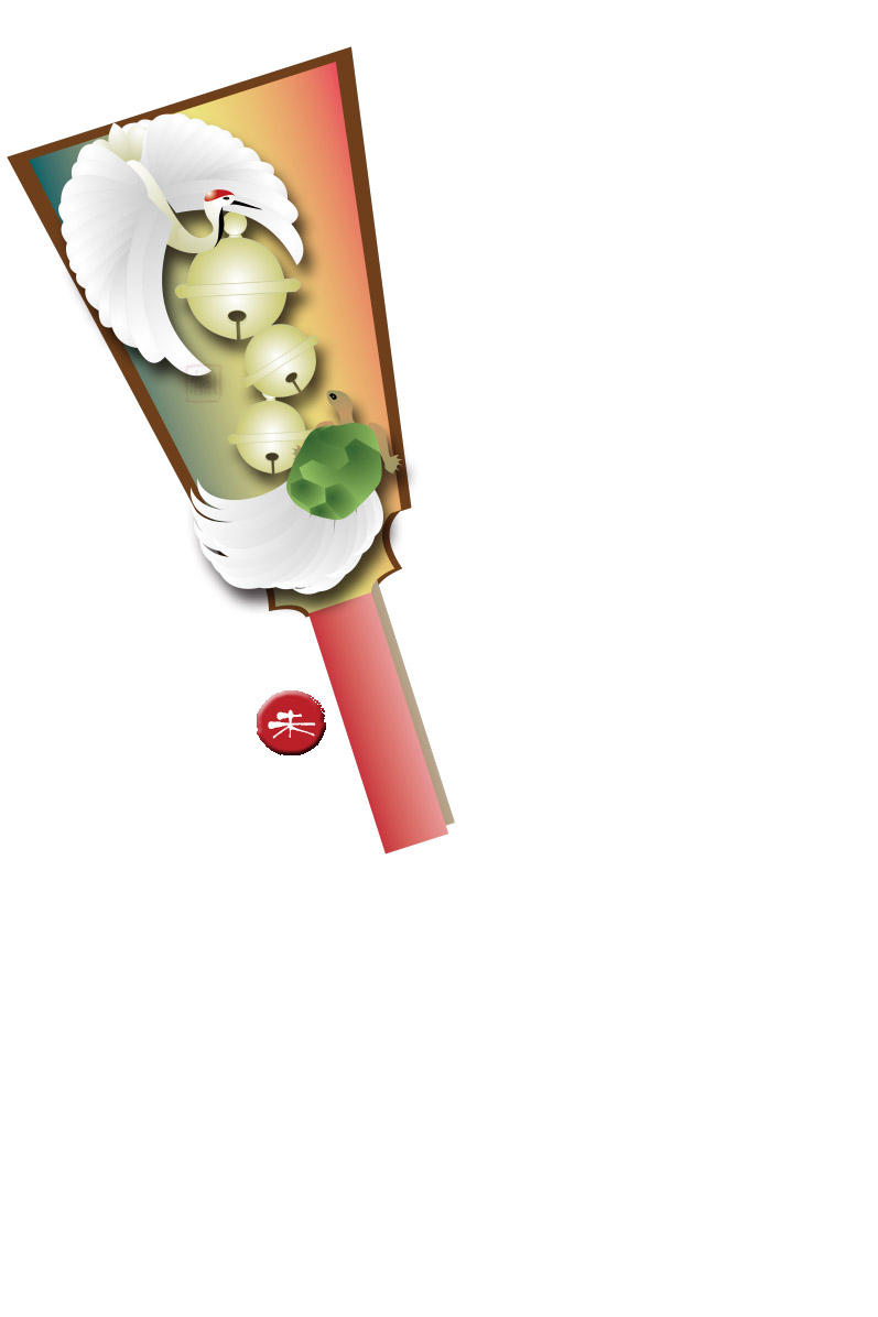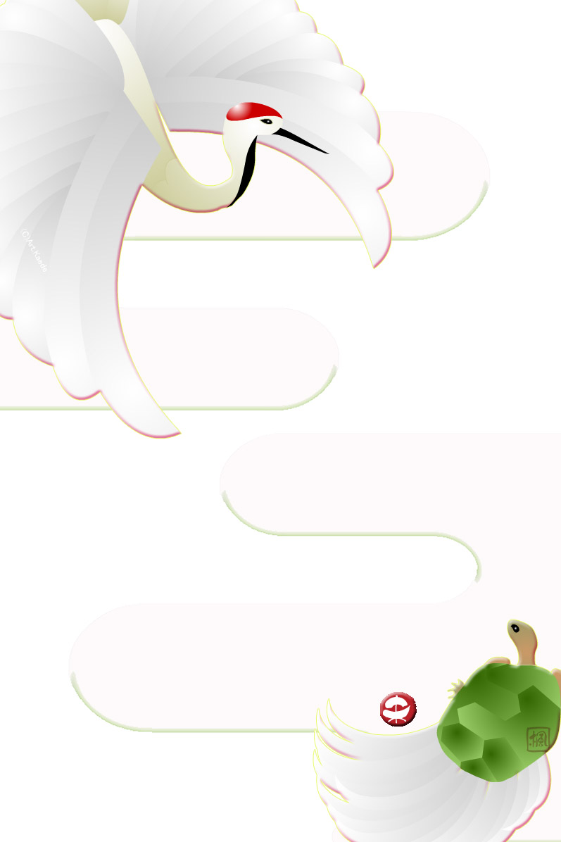 丸い鶴と亀のイラストはやさしいイメージのやわらかい色合いで作っています。