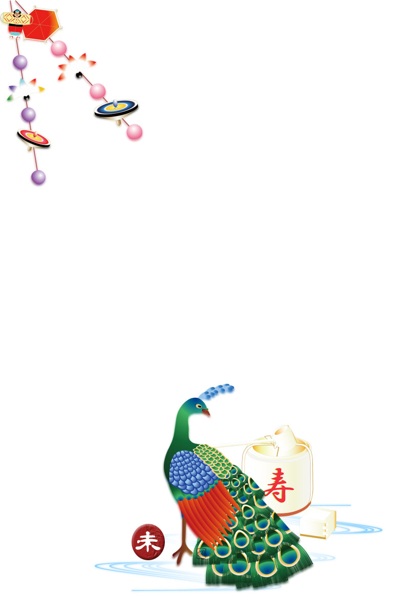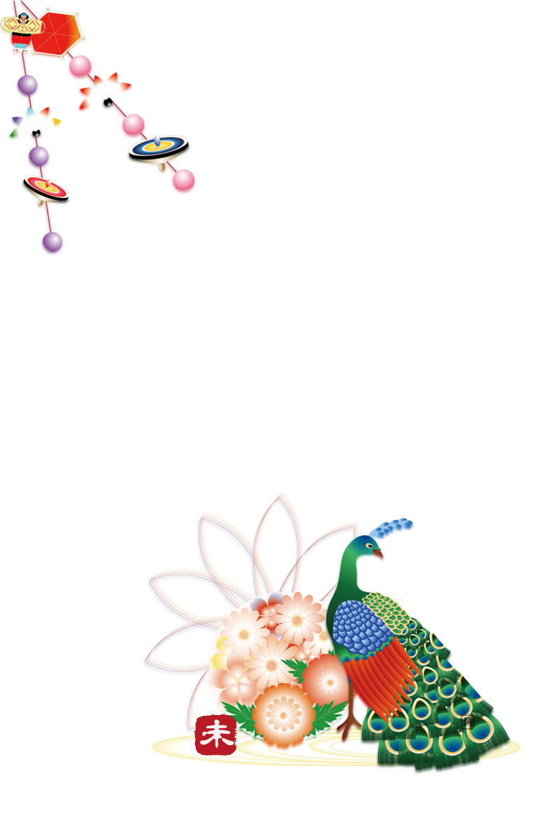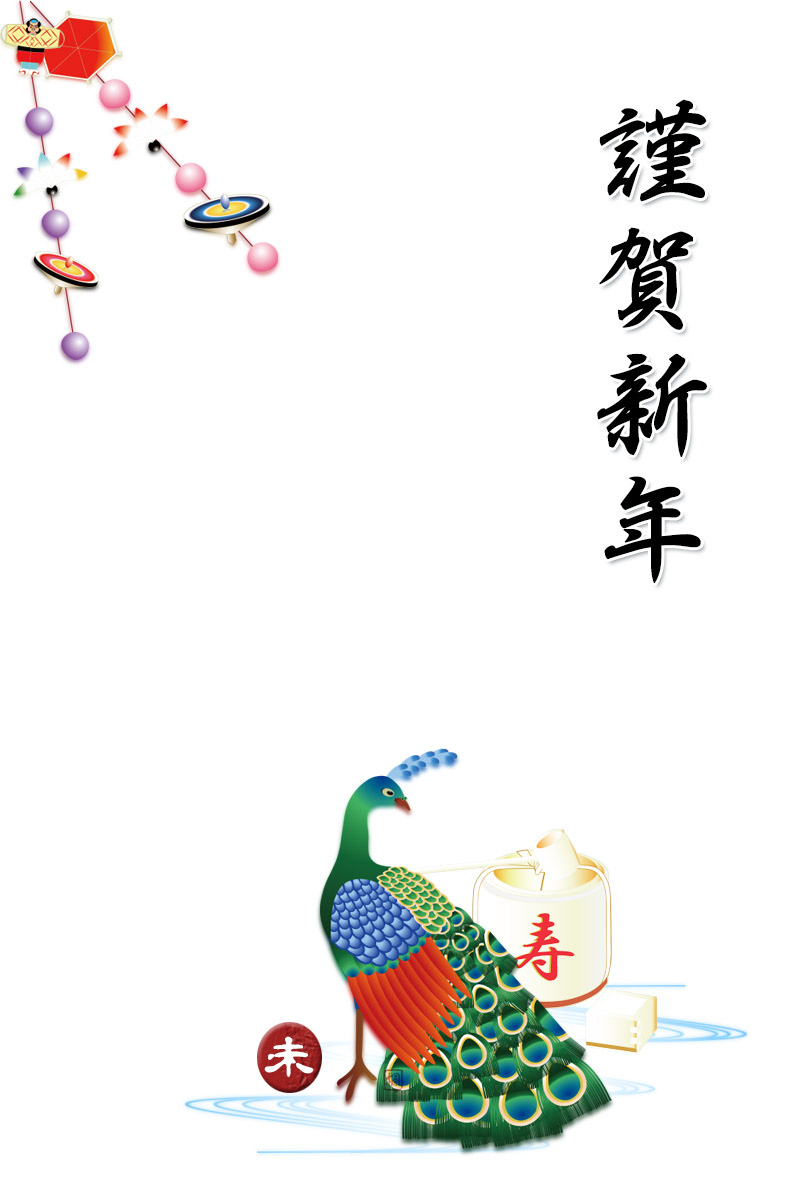 年賀状テンプレートは孔雀とお正月物の玉飾りと手まりのイラストです。