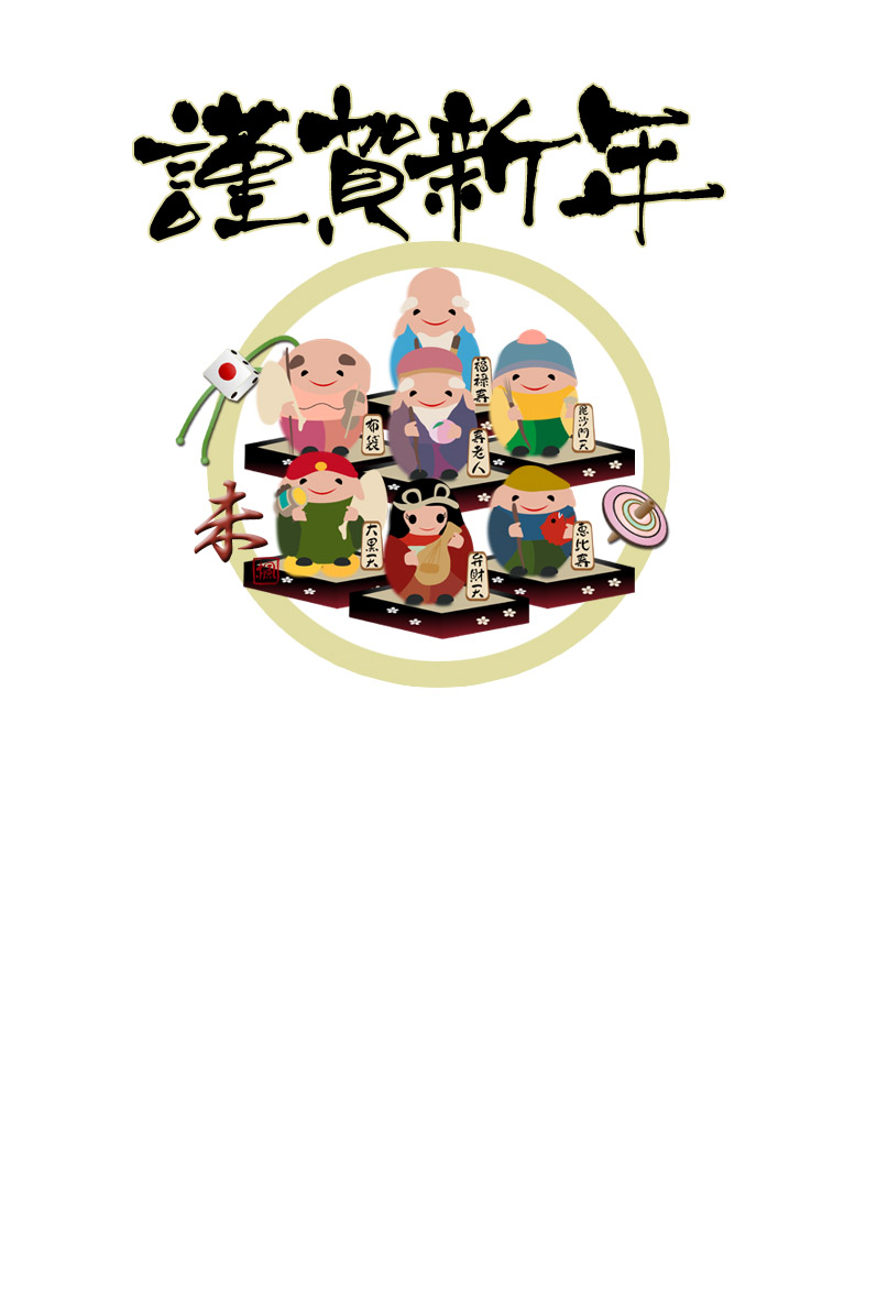 年賀状テンプレートは丸くて可愛い七福神が宝船に乗っているイラスト